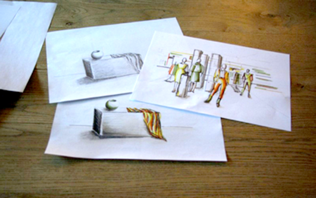 Nach einem kurzen theoretischen Teil zur Räumlichen Perspektive, Farbperspektive und der Technik der schnellen Handskizze mit Bleistift, Farbstift und Layoutstiften, wurde Hand angelegt. Die Teilnehmenden entwarfen einfache Ladensituationen, wie Schaufenster, POS mit Fashion oder Hardgoods in der richtigen Perspektive und wendeten Kniffe der Layout-Technik an.